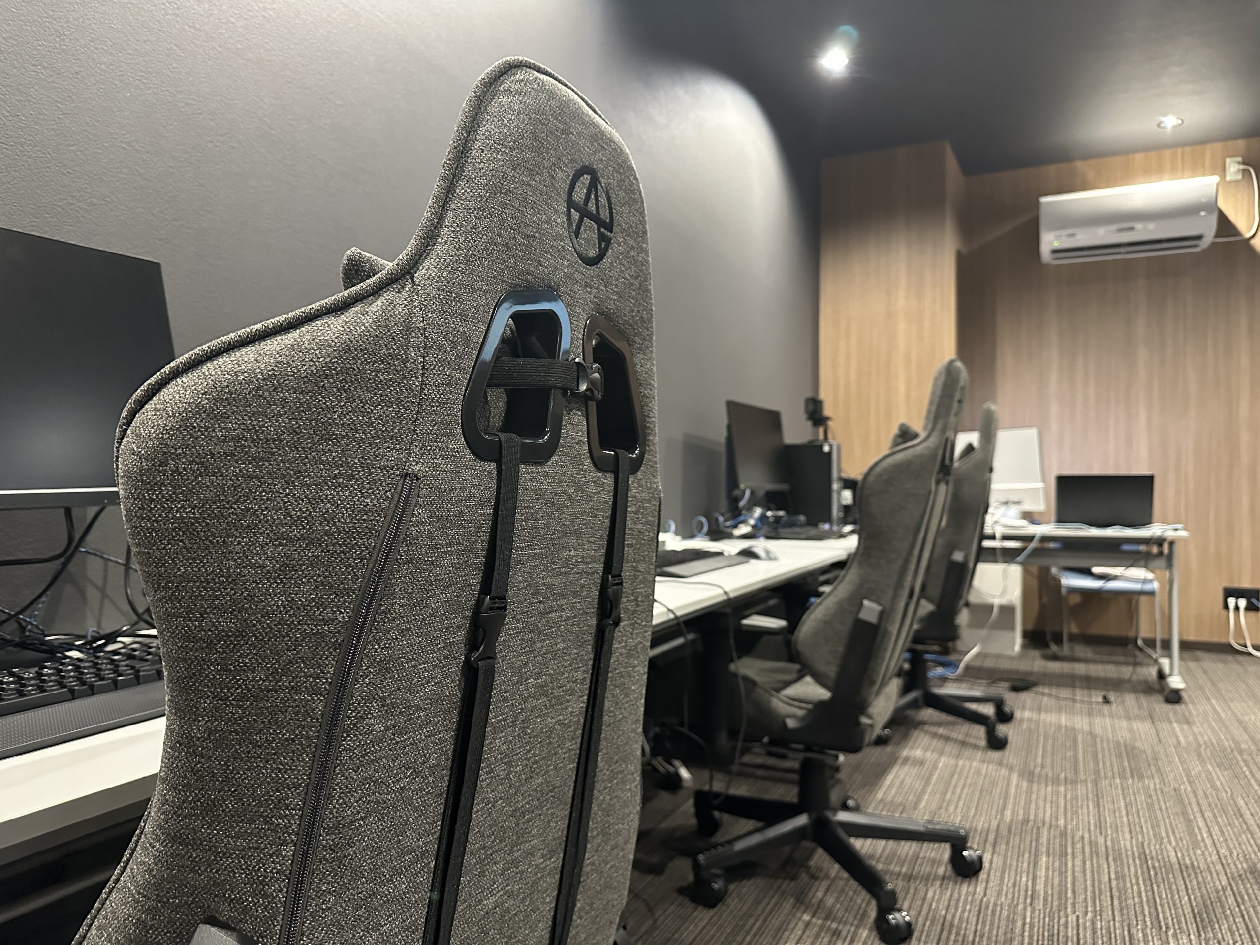 導入いただいたSeAGA-04 ゲーミングチェアGYは、通気性が良く肌触りの良いファブリック素材(グレー)を使用しており、長時間の着座でも蒸れにくく、オールシーズン快適に利用できます。練習環境にふさわしい、統一感のあるシックな空間に調和しています。