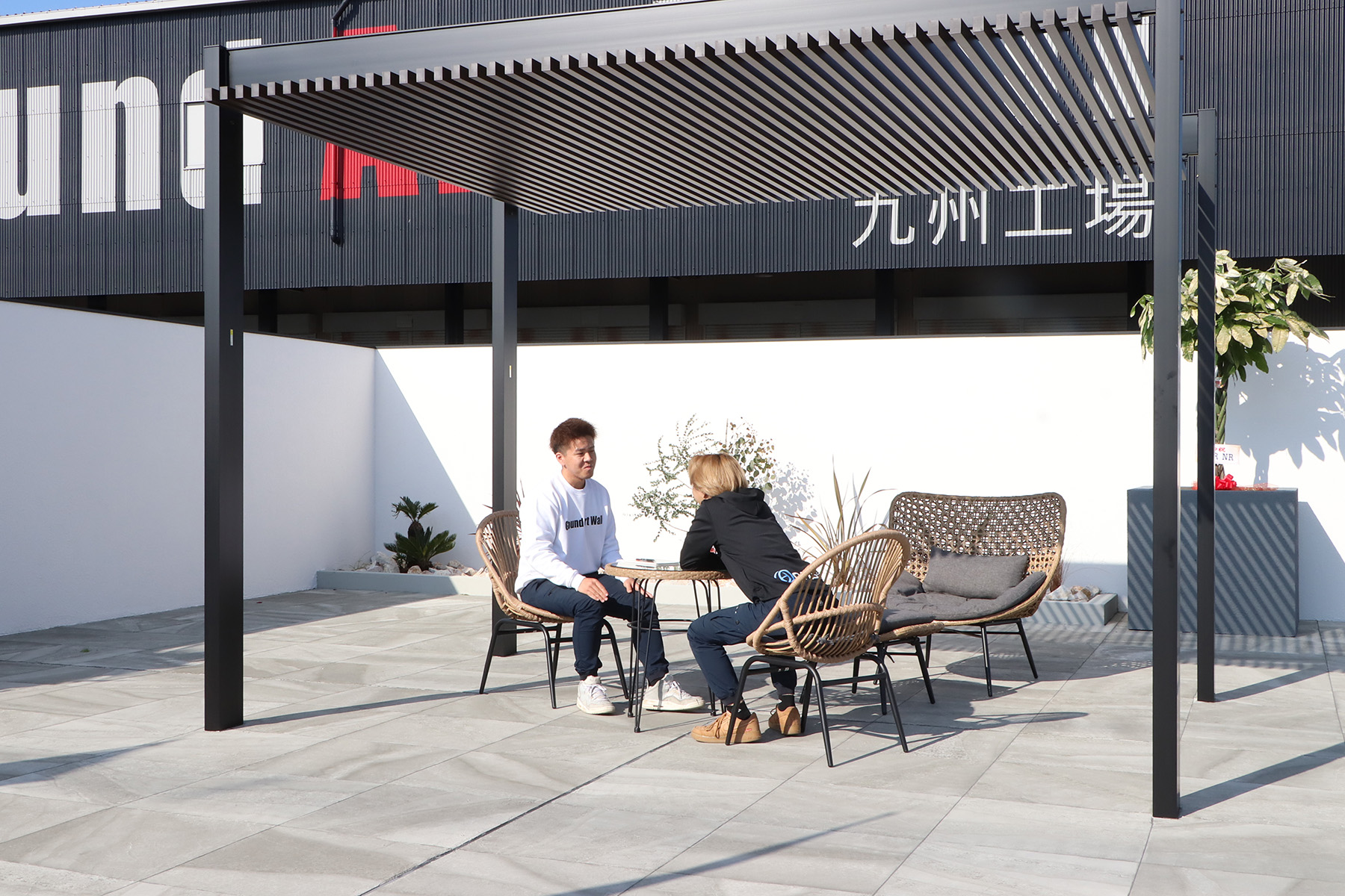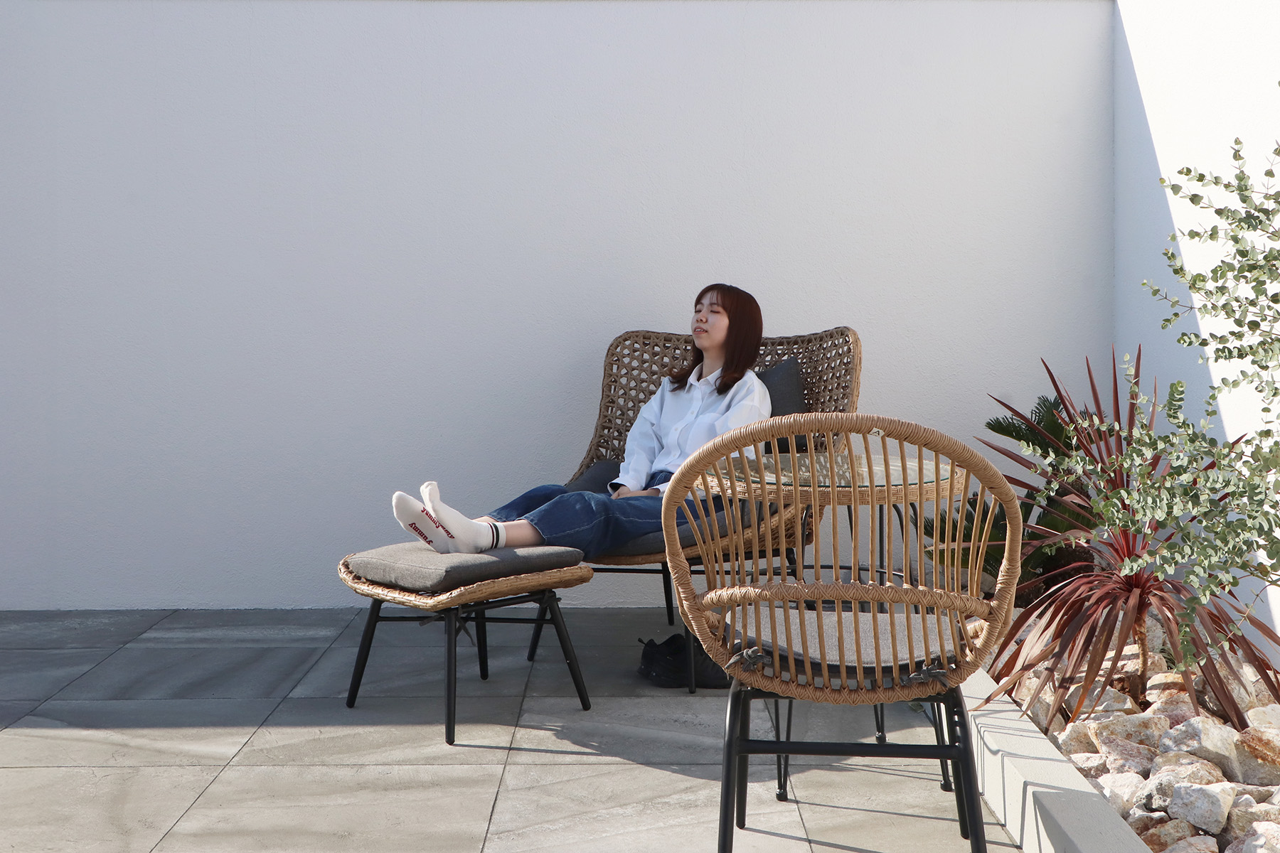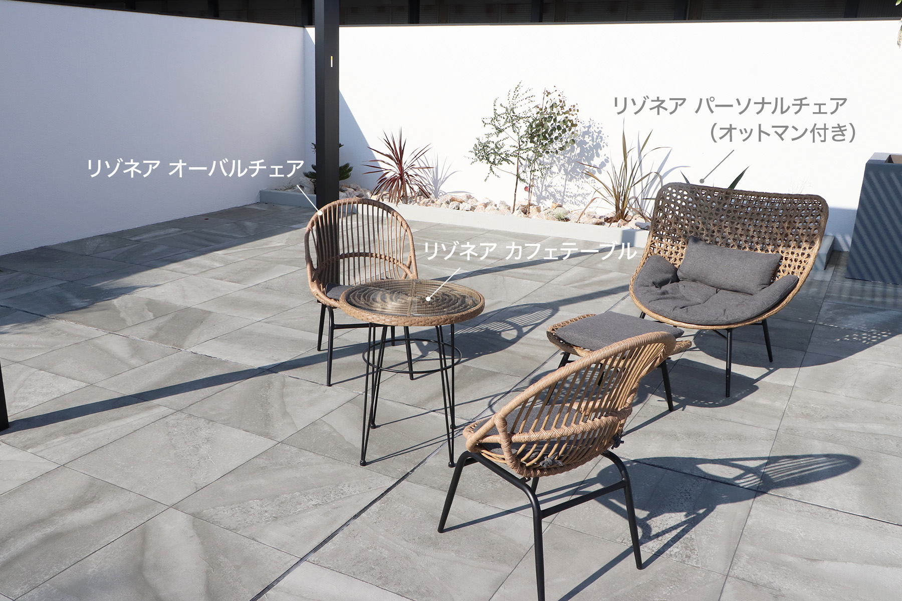東馬のラタン家具が外の空気と自然に馴染み、
