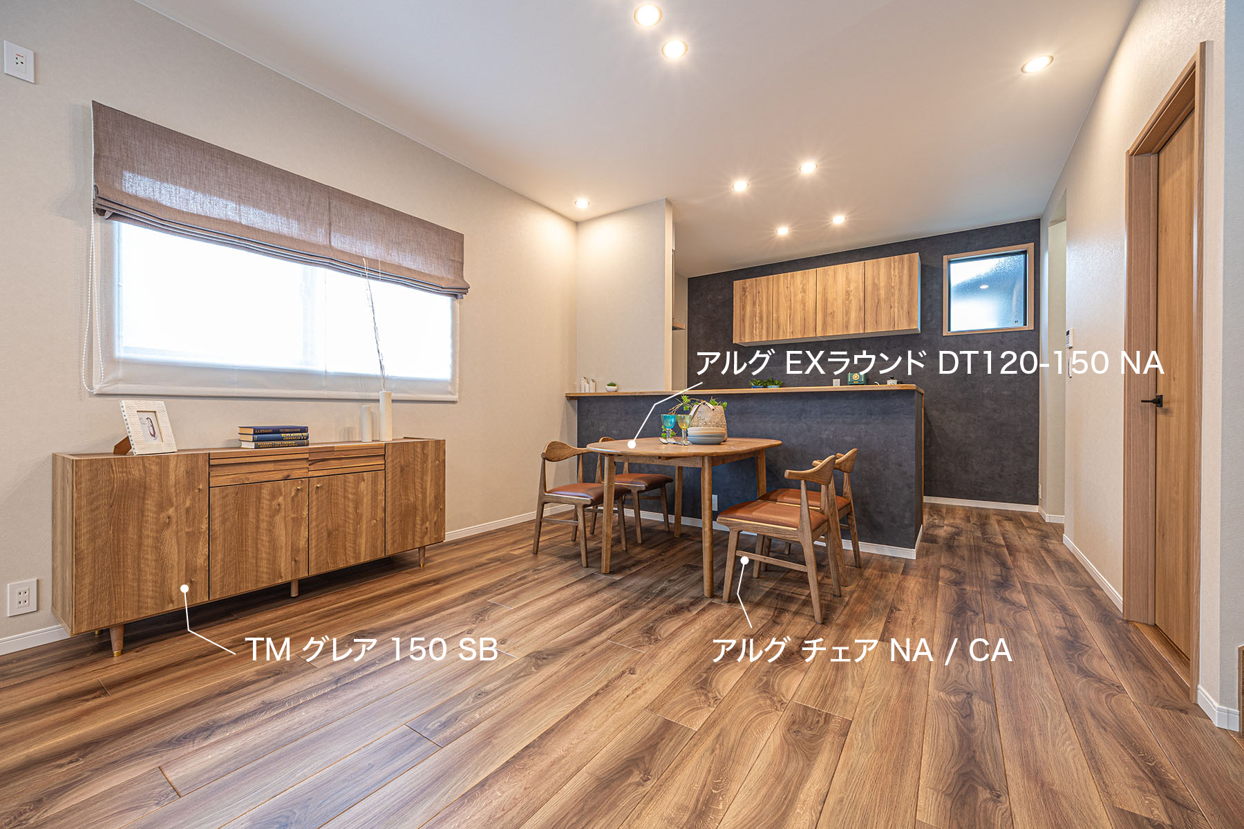 ・アルグ EXラウンド DT120-150 NA:シーンに合わせて天板サイズを変えられる、便利なダイニングテーブル。