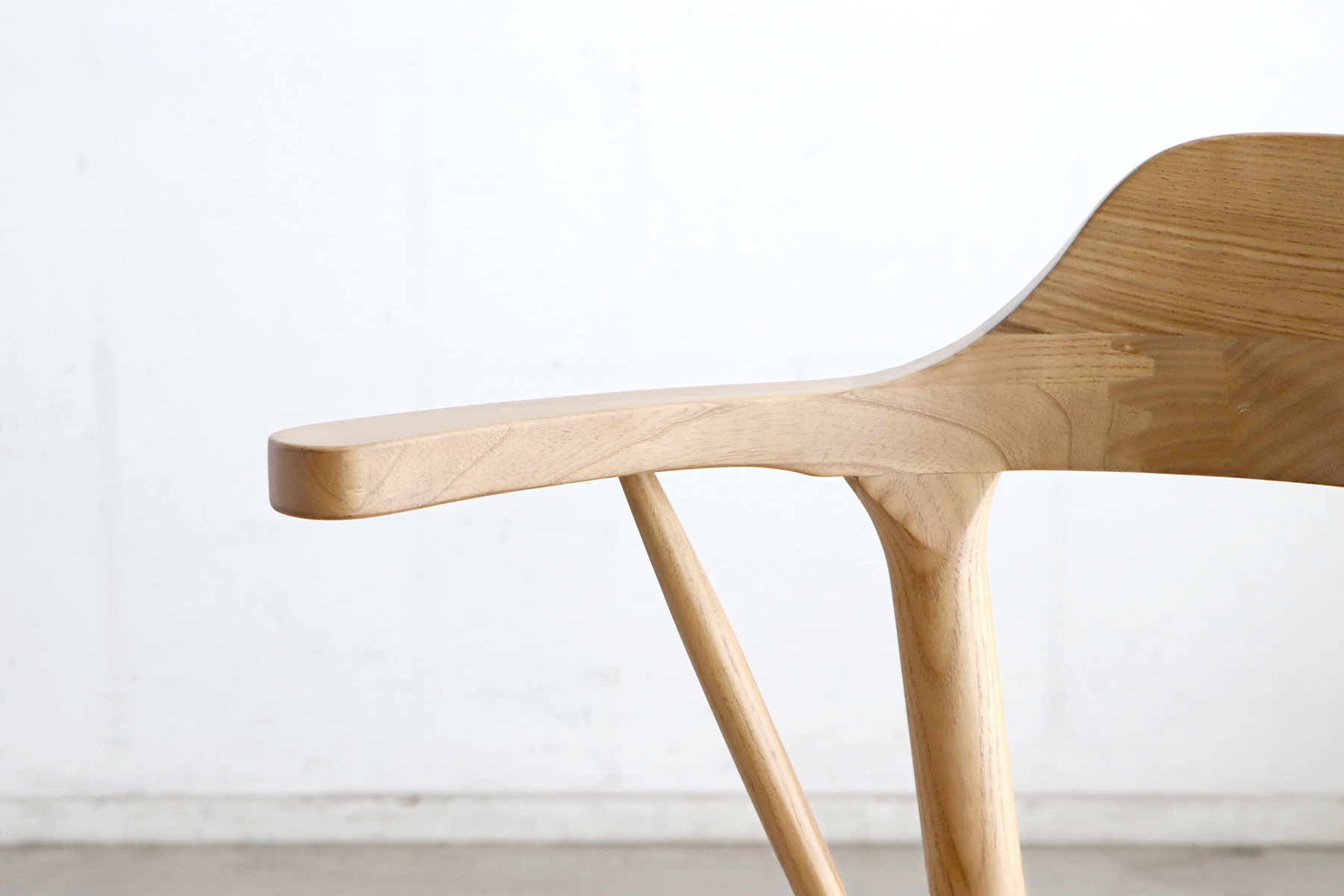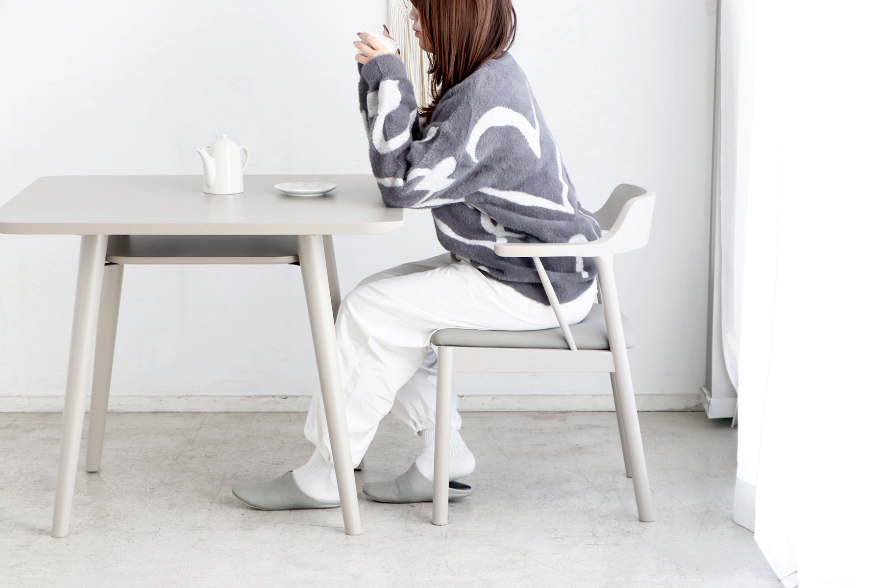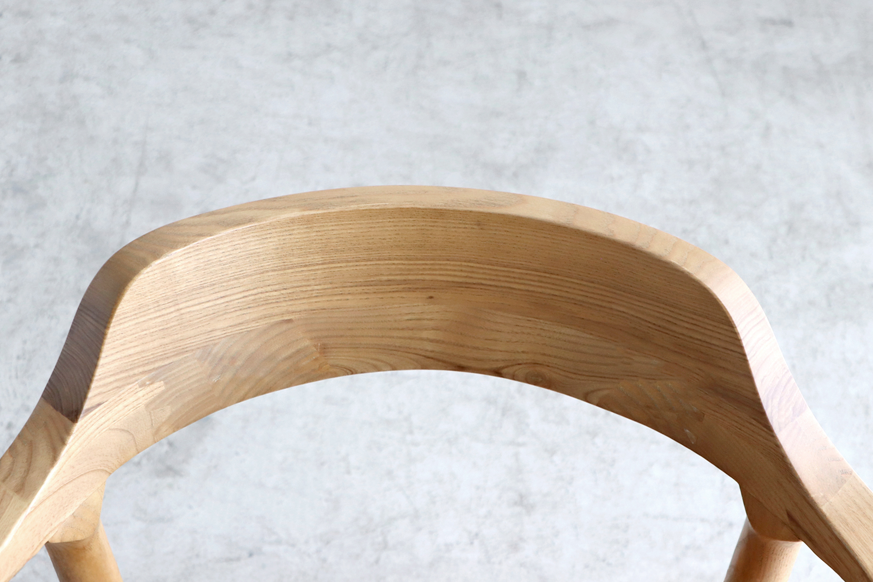 背中や腰に沿ってカーブしたラインと、肘を自然に預けられる絶妙な高さが、座る人の身体をそっと包み込みます。