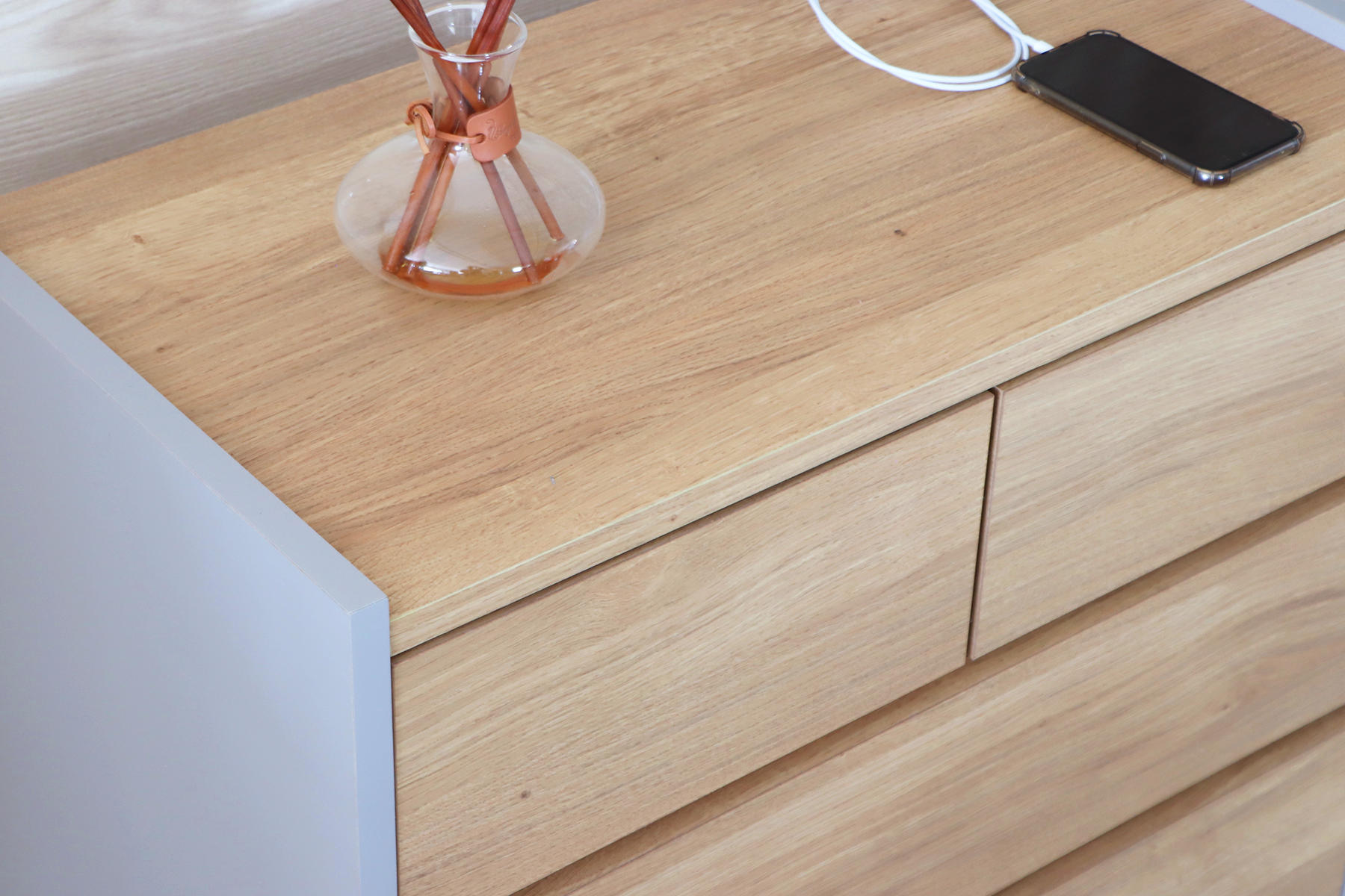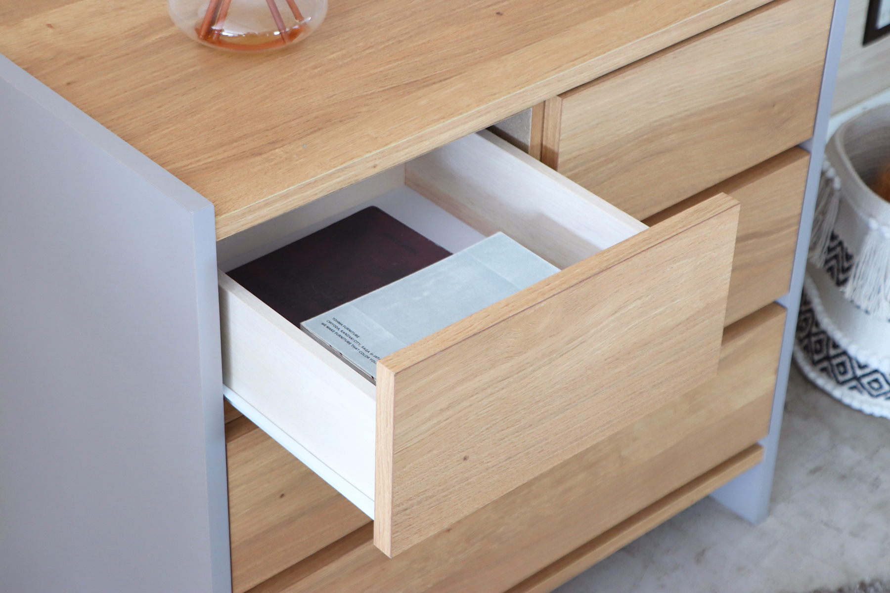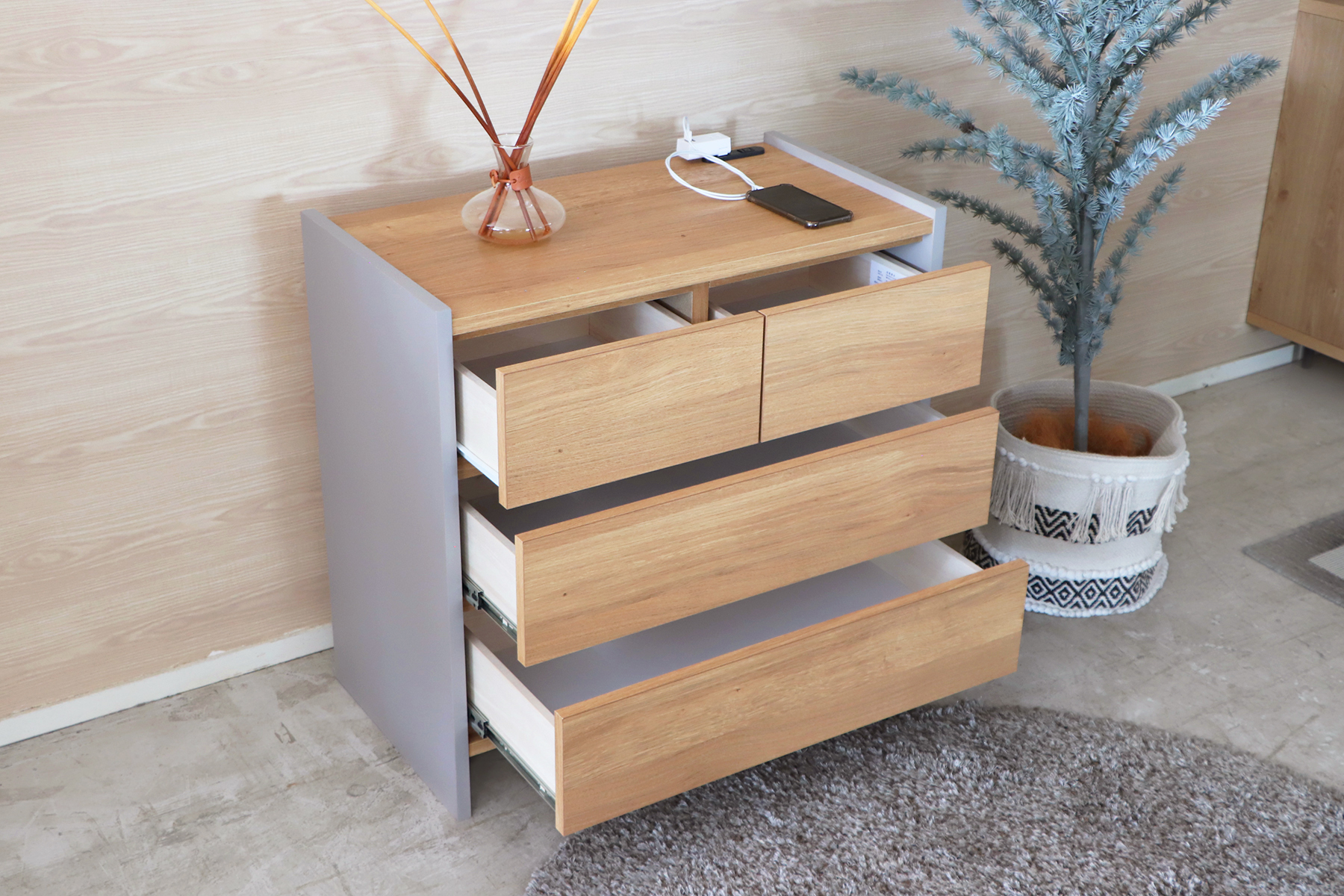 3段の引出し収納で、衣類や日用品がたっぷり収納できます。