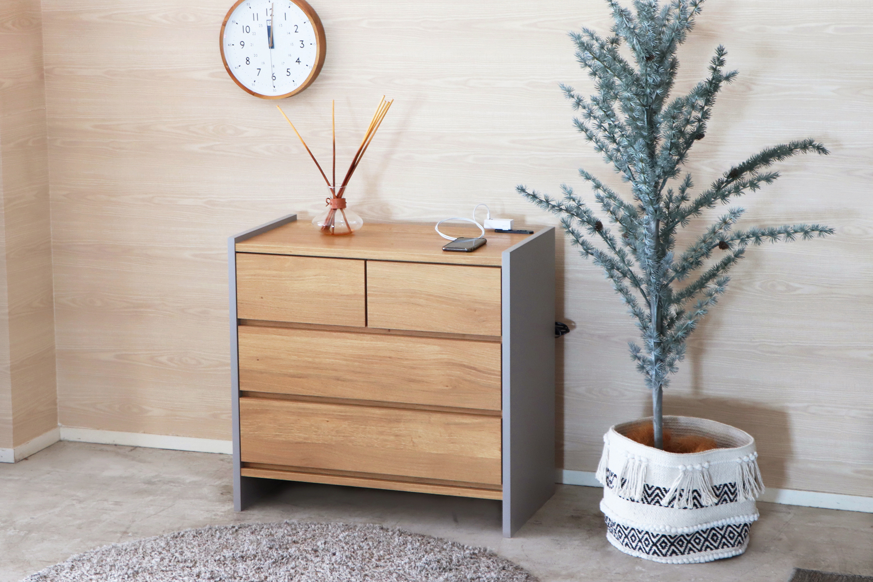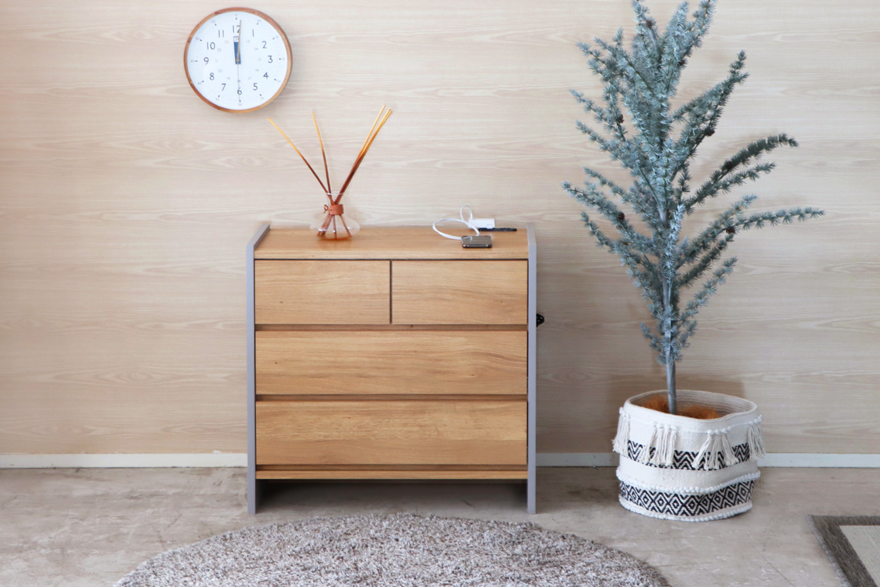 ナチュラルと淡いグレーの組合せがトレンドをおさえたリビングアイテム。