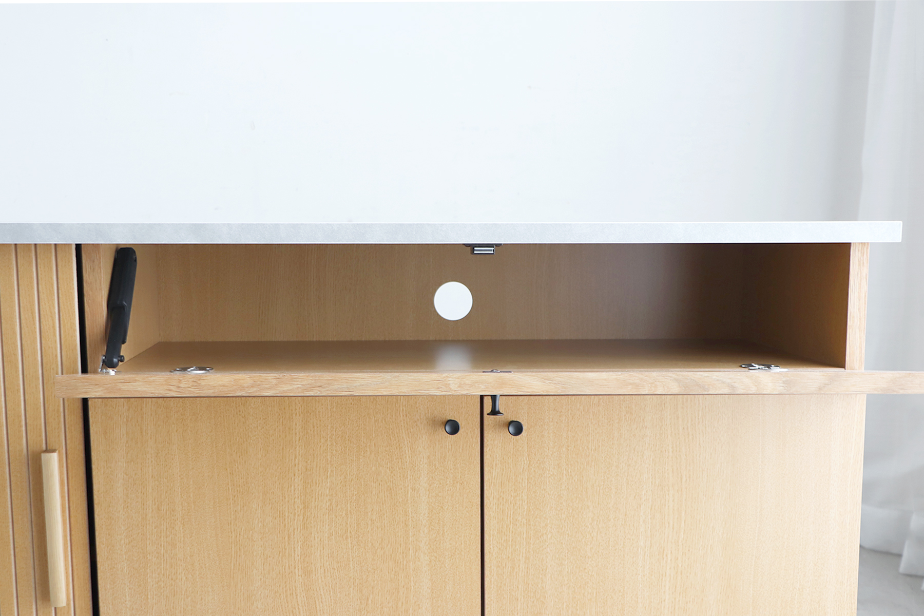 配線穴付きなので、オーディオ機器などの収納にも対応。