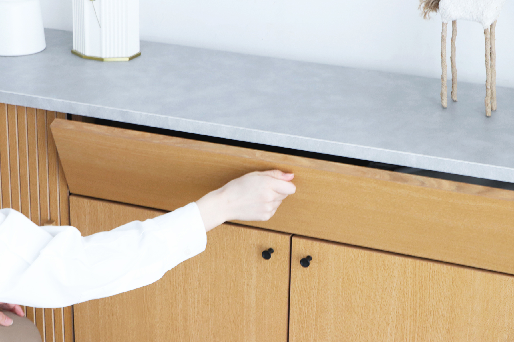 扉付きの収納で、中に入れたものをさっと隠せて、空間はいつも整った印象に。